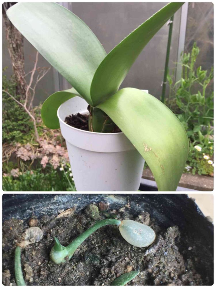 ハエマンサス属オルビフロス(眉刷毛オモト)の種の発芽状況。