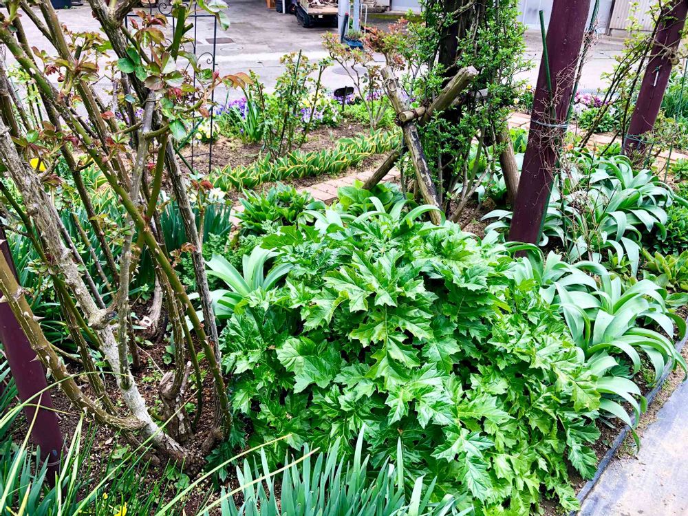 手前のモリモリ茂っているのはアサンサスモリス…右上の綺麗な葉はアリウム🌸🌿🌸🌿