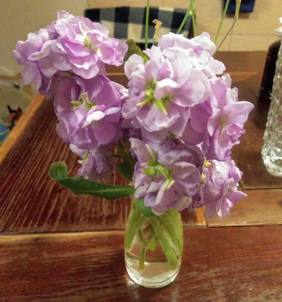 ガーベラ、シレネは終わって、八重咲きストックの先の方が残るのみとなりました。ほぼ、先の蕾まで開ききりました。最後まで楽しみたいと思います(^-^)