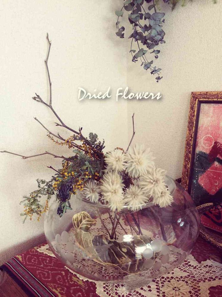 ドライフラワーにしたものを金魚鉢にポンポン入れてたらいい感じになりました♪