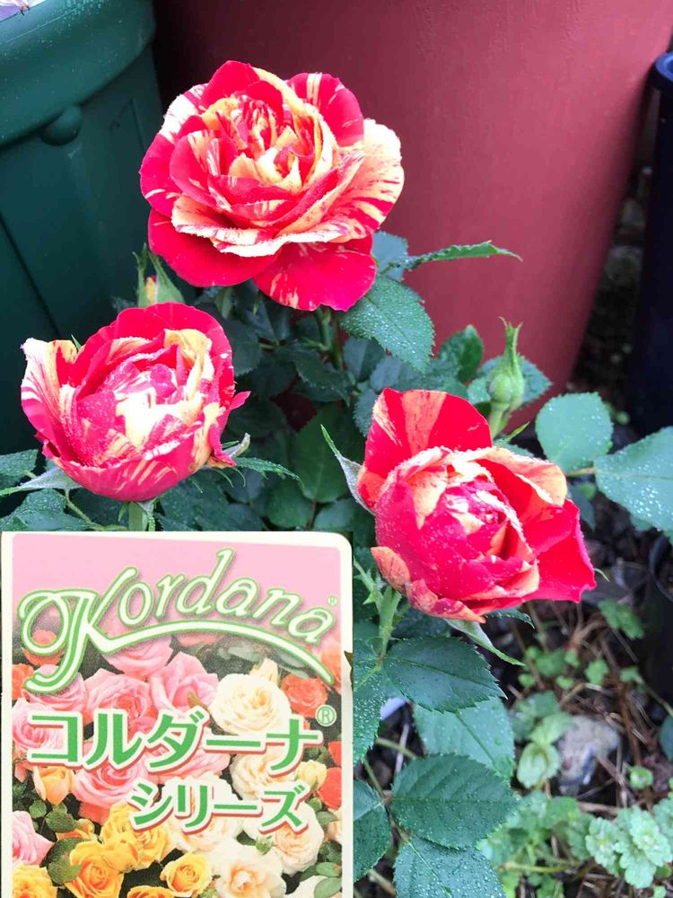 ホーカスポーカス・コルダナは大輪の赤色と黄色の絞り模様が特徴的なミニバラ♪