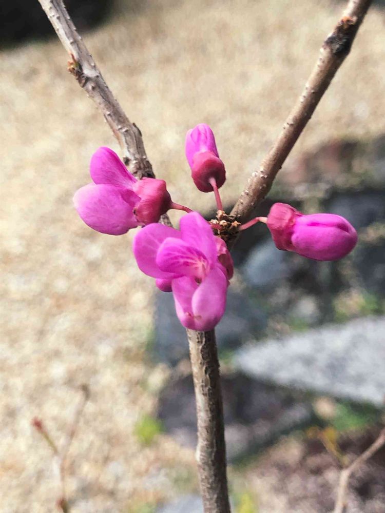 4月だね!朝、雨戸を開けたら花蘇芳の花が開きそうでした!芽出しが遅くて心配してたので喜びひとしおです!
