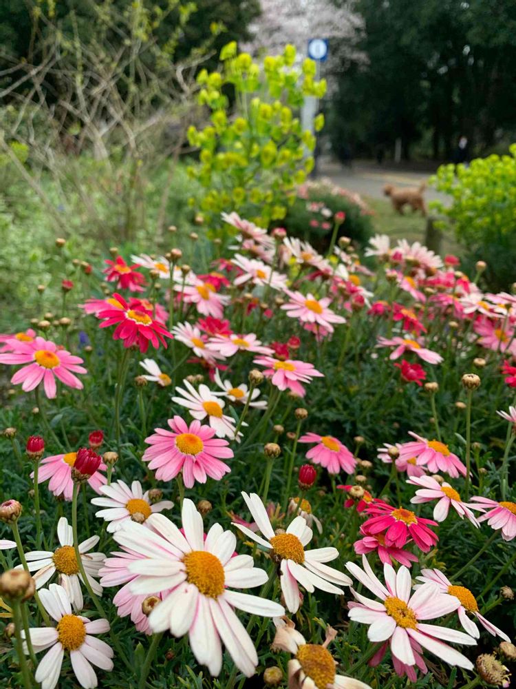 パァーっと明るいお花達、お散歩中のワンチャンも