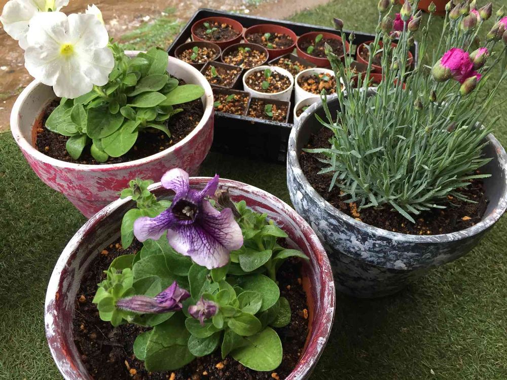 今日は仕事休みなので、スーパー行ったら、🌸お花が私🌼見てるので、100円のペチュニア2と200円のカーネーションみたいの1購入して、そのままダイソー寄って鉢買ってペイントして、乾くよりも早く植えました💁♀️後ろの芽🌱は、クリスマスローズです!種頂いたので、去年の10月頃蒔きましたー大丈夫かな😕