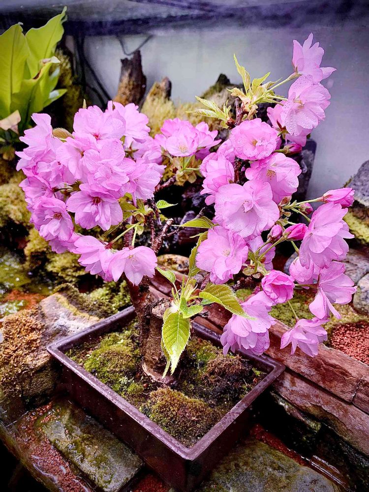 外出自粛のおり、テラリウムに移した桜の盆栽が思いのほか艶やかに🌸。