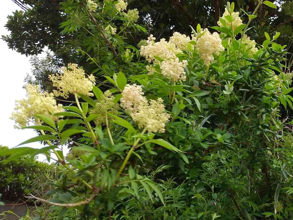自然と住宅地が混じり合った場所に咲いていました。細かい白の房状のお花です。