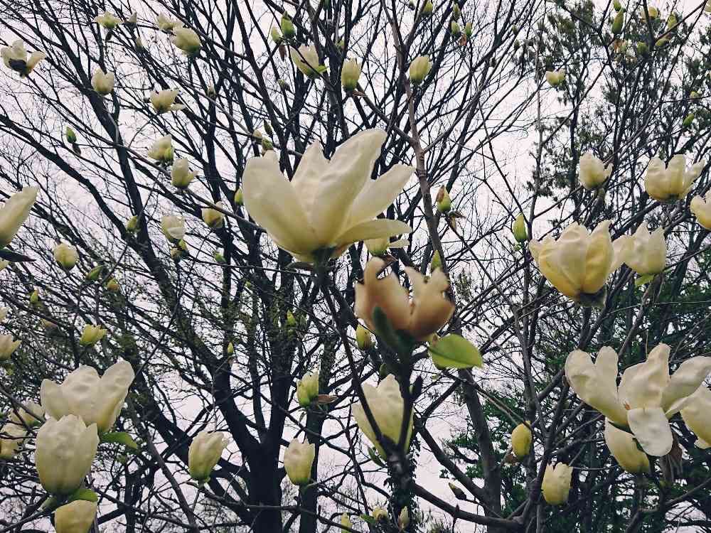 空がグズってたけど綺麗なハクモクレンだなぁ……ん??