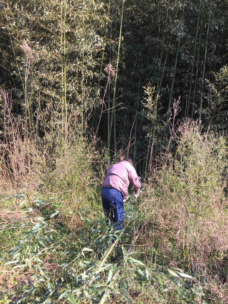 実家近くの河川敷で父と竹取り。野菜の支柱に使います。