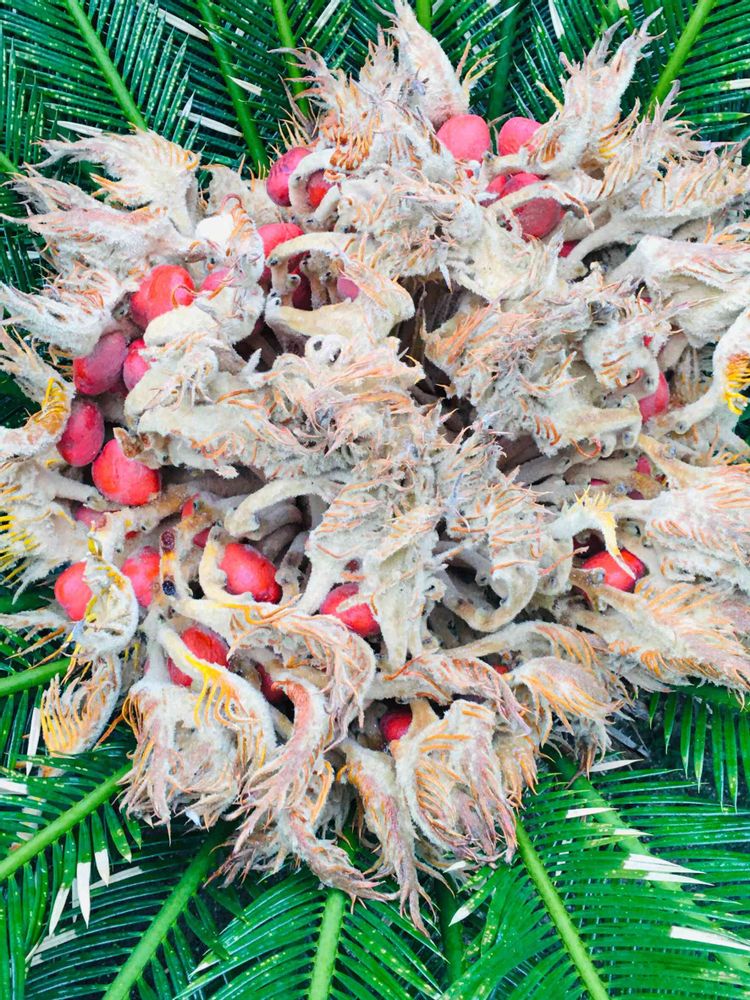 ソテツの雌花…山伏茸を大きくしたような白い球状、赤い実は秋に付きます。実は