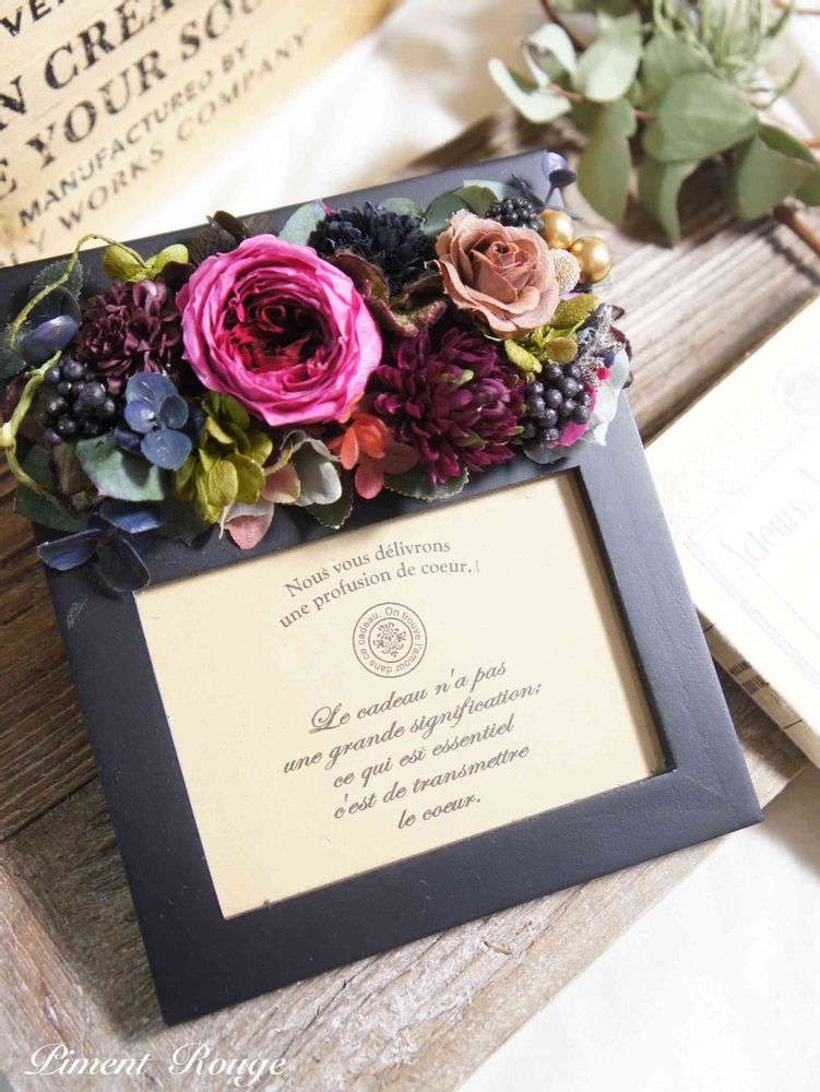 〈エスプリピンク〉というプリザーブドフラワーのバラ。ブラックのフォトフレームと合うだろうなぁと作ってみたかった色合いです。
