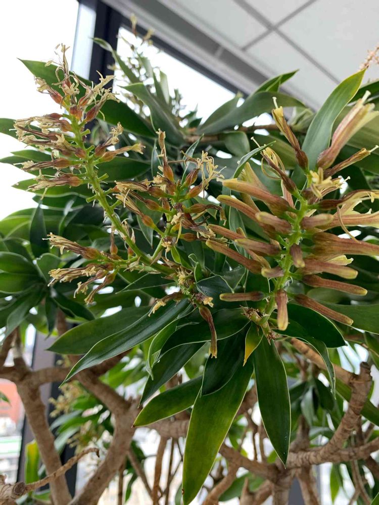 会社にある観葉植物です。先端のめしべのようなものがポロポロ落ちます。これは正常な育成なのか、何らかの異常が起きているのか分かりません。どなたかお知恵をいただきたいです。