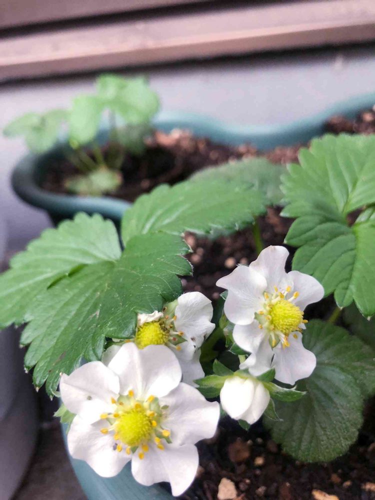イチゴの花が咲いてきたー。株が小さいので摘花したいけど、早く実った姿が見たいのでそのままに。
