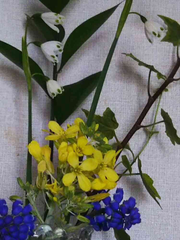 ここのところ、雨がちで倒れてしまったスノーフレークとムスカリ。葉ぼたんのお花とあわせて飾ってみました~(*^^*)