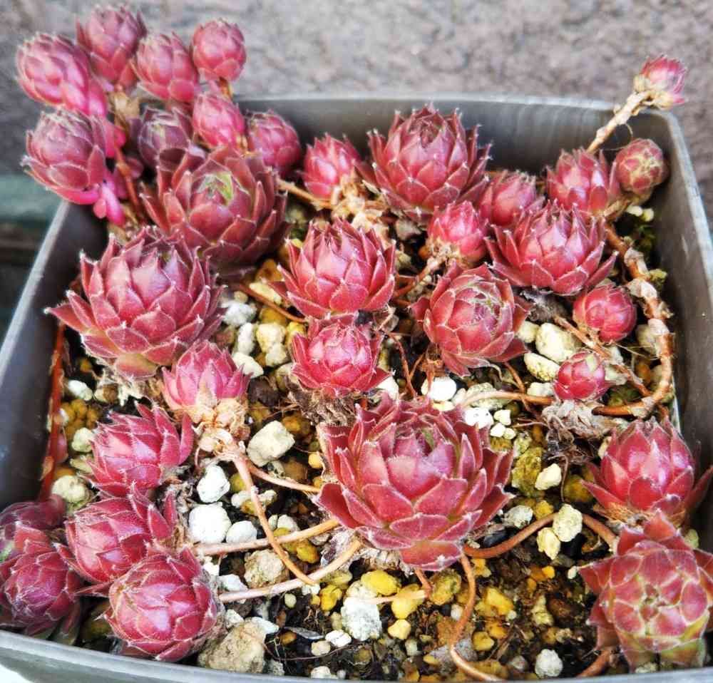 センペルビウム・ロージーさん。1年中塀の上でお日様に当てているため今はこのお色ですが開いてくるともっと淡い色合いになってきます😊