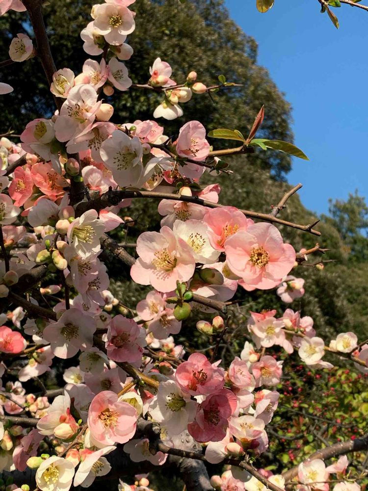 青空に映えるボケの花が綺麗でした!