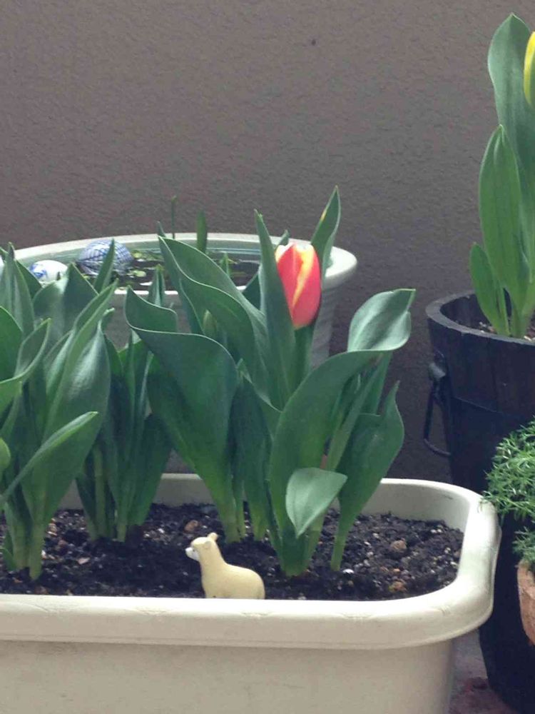 今朝のチューリップ、咲いてきた〜🌷小雨でも空気はあったかいです。