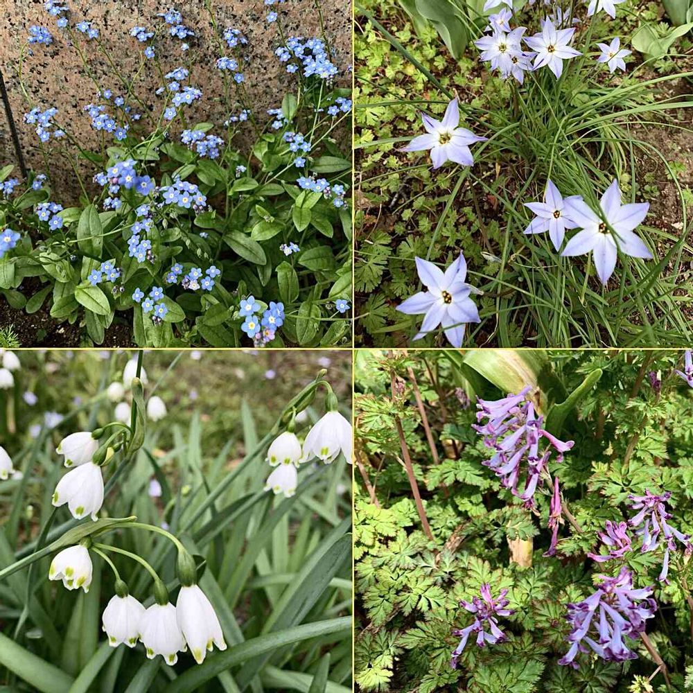 ---ワスレナグサ(ムラサキ科)、ハナニラ(ヒガンバナ科)、スノーフレーク(ヒガンバナ科)、ムラキケマン(ケシ科)