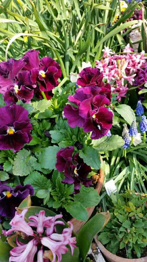 ムーランフリルパンジーのビオレッタ。マットな紫がカワイイ。ヒヤシンスやムスカリ、花の終わった水仙に囲まれてます。