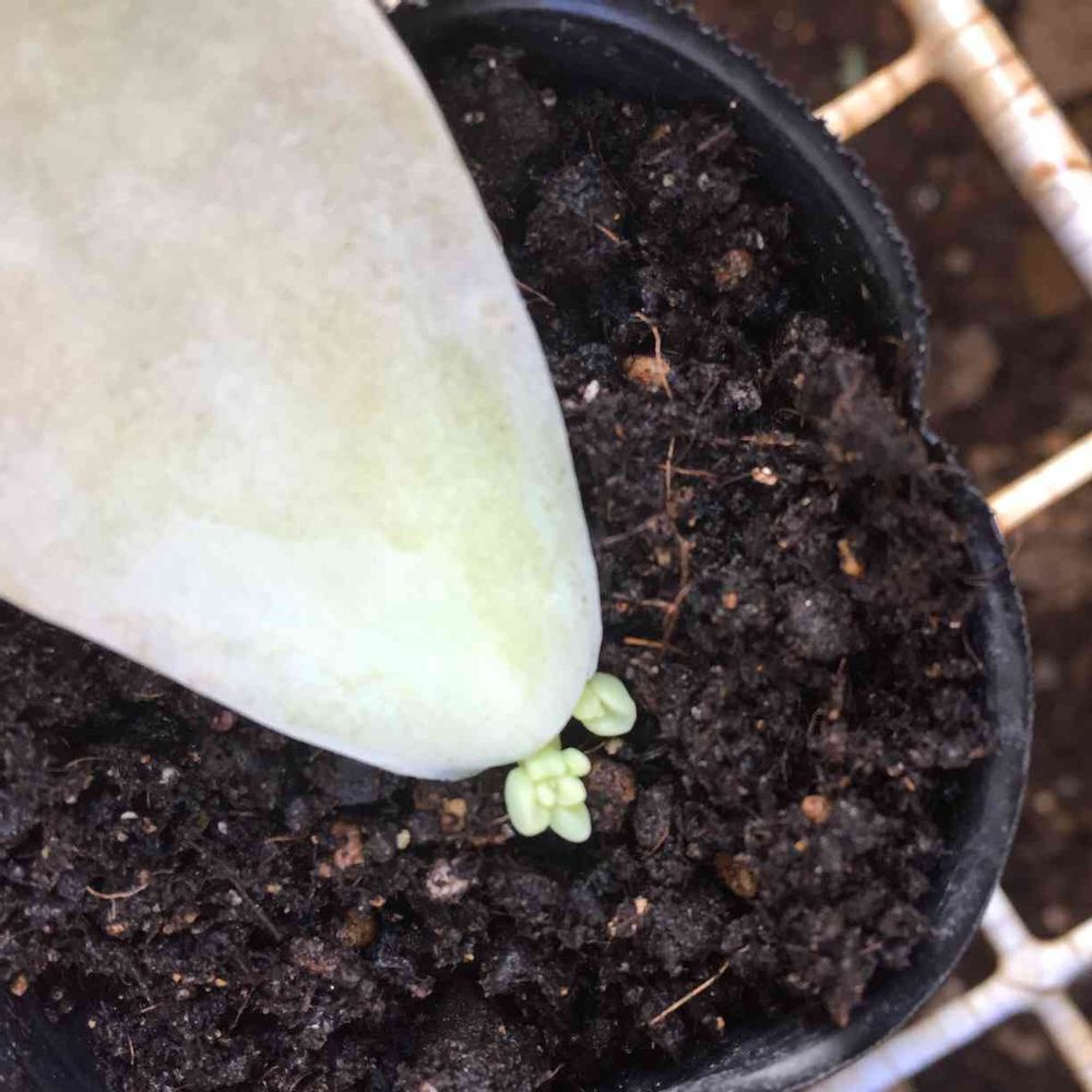 まず、元の株から葉っぱだけを取って切り口を乾燥させるように土のないトレーに置いていて、根や葉っぱが出てきだしてから、土の上に置いたと思います。