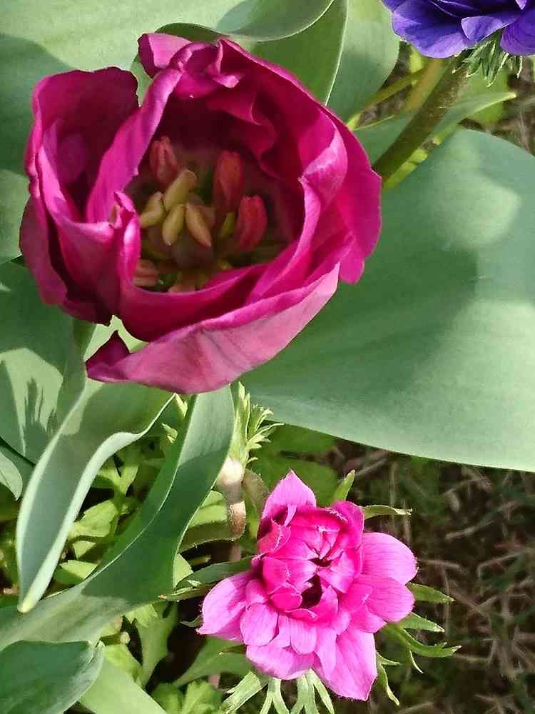 一緒に植えていました、チューリップは赤紫色💜横にはピンクのアネモネが並んで咲きました。チューリップの蕊がしっかり写っていました。