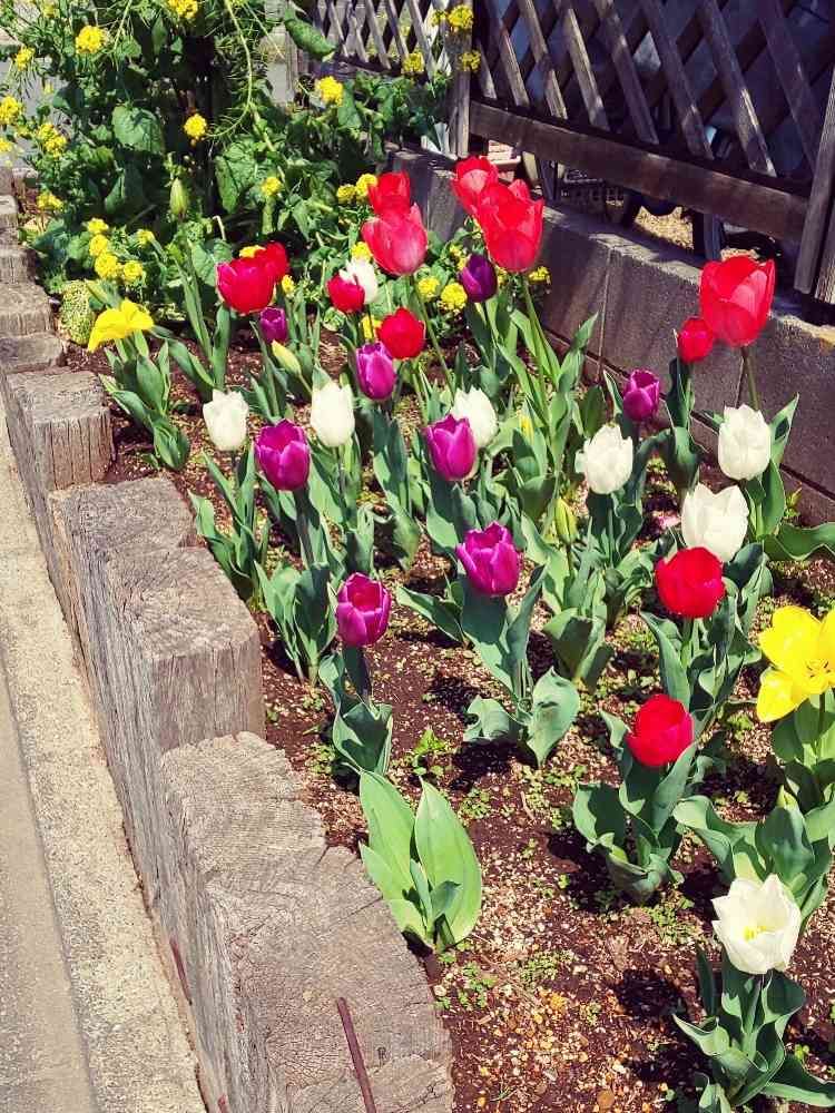 ワンコの散歩の道すがらにパチリ📸、色とり採りのチユ―リップかわいいですね。❣️