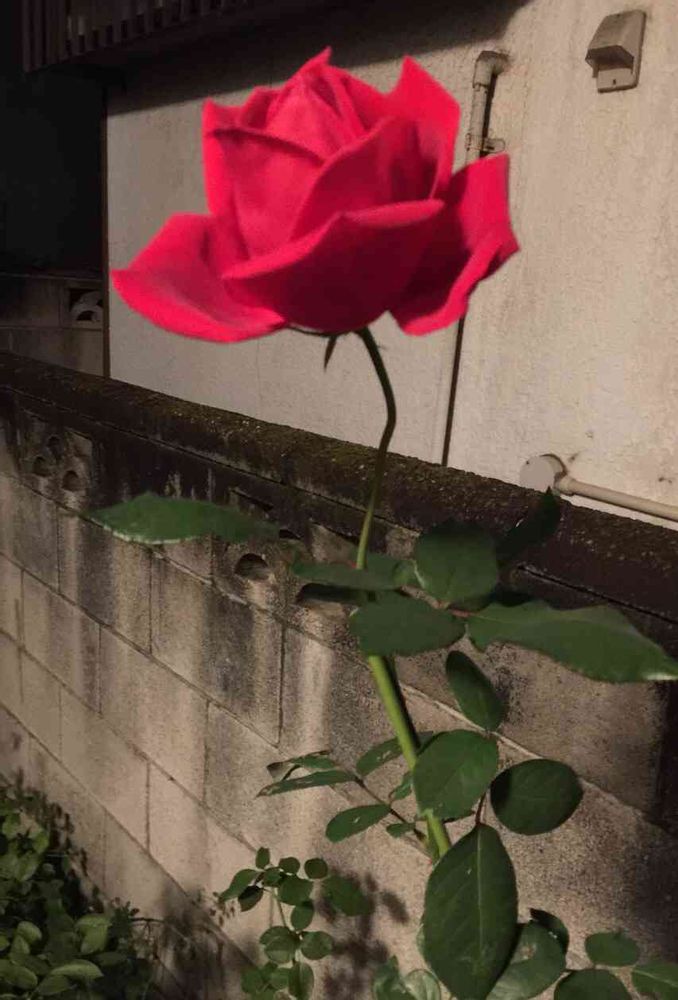 2016/11/26 夜間撮影。未だ11月だというのに連日最低気温0〜2℃と、東京では観測史上稀に見る寒さ。この.2日前には❄️雪も降りました。そんな中で奇跡の如く、2m丈の最頂部に花径12cmの花が一輪咲きました。凛としたその姿はその名の通り気高く美しい!この四季咲きの薔薇は「クリスチャンディオール」です。低気温のお陰で3週間もの間、色褪せることなくこのままの姿を保っていました。夜仕事から戻って玄関灯を点けると、そのライトアップされた美しさが格別で、毎晩見とれて寒い中佇んでました。