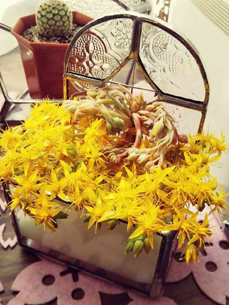 薄化粧のお花をカットして、ステンドグラスのテラリウムに入れて飾りました💖