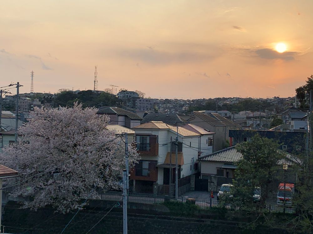 洗濯取り込みながら、ふとみると、桜🌸と夕日。
