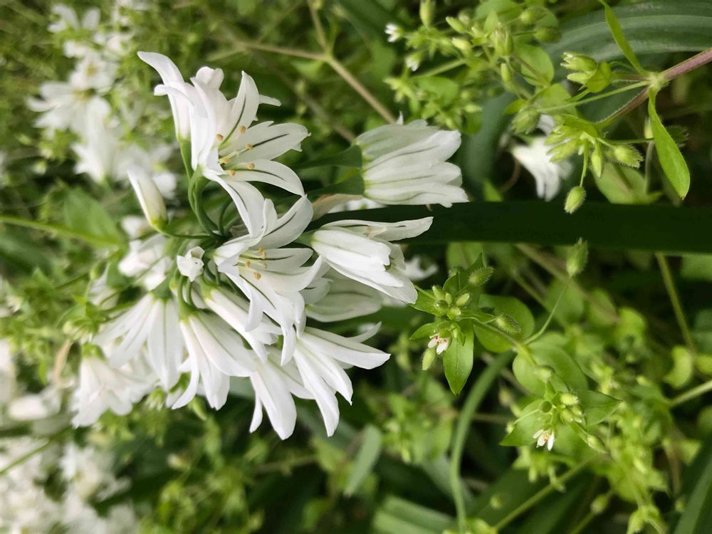 このお花はミツカドネギ(別名 アリウム・トリクエトルム)だと思います。。私が昨日アップしたものとそっくりです。花弁に緑の線があります。ヒガンバナ科ネギ属です。
