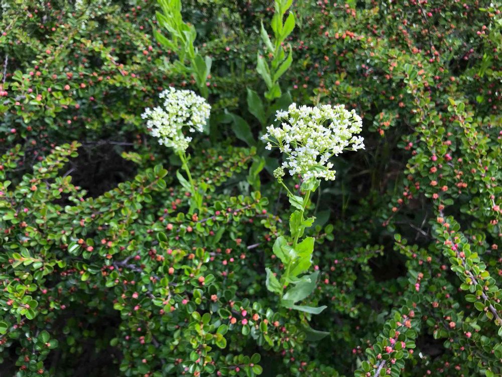 コトネアスター(調べてわかりました)の植え込みの中に割り込んできた白い花をつけた雑草。