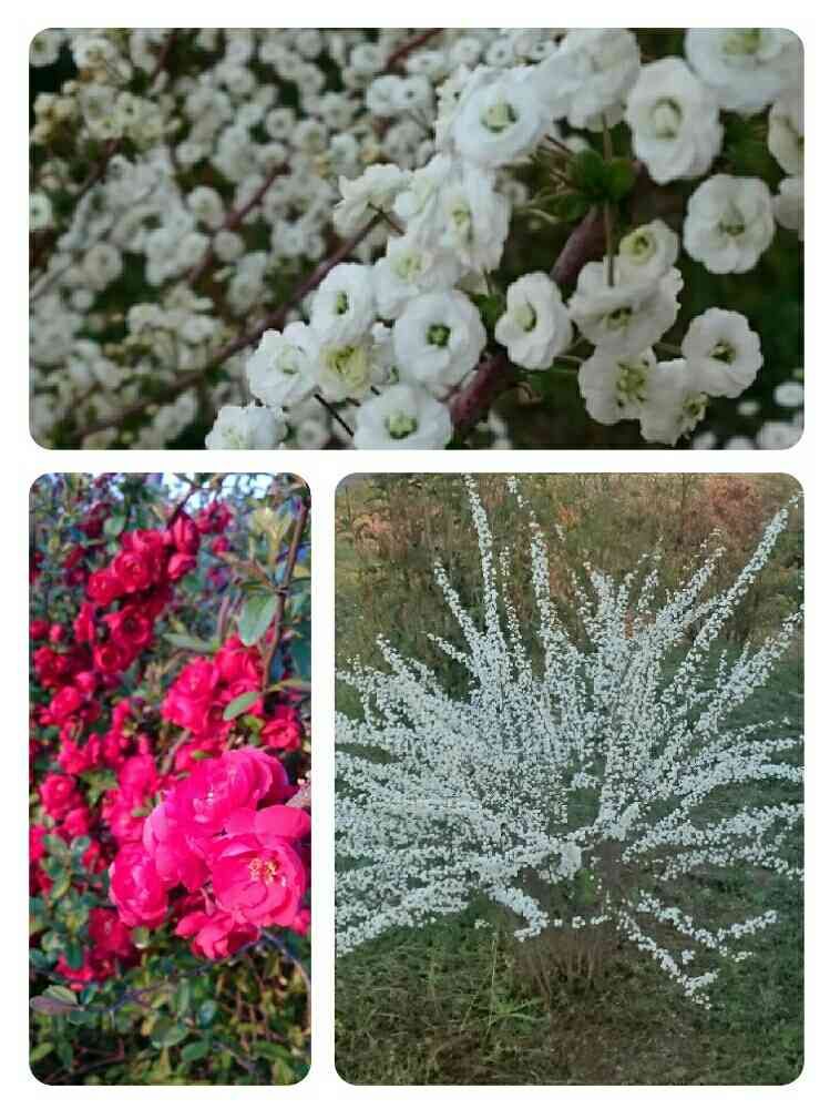 お庭では、真っ白なシジミバナと真っ赤なボケが、競うように咲いてます‼