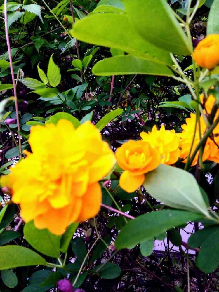 散策の途中の生垣に、八重咲きの山吹の花が、綺麗でした。