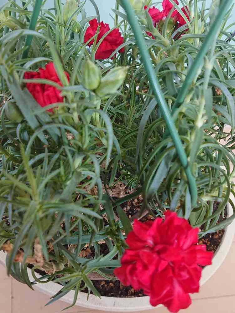 四年前に、息子から人生初の母の日プレゼントで 貰ったカーネーション、今年も咲きました。ノビノビしすぎて倒れてくる💧