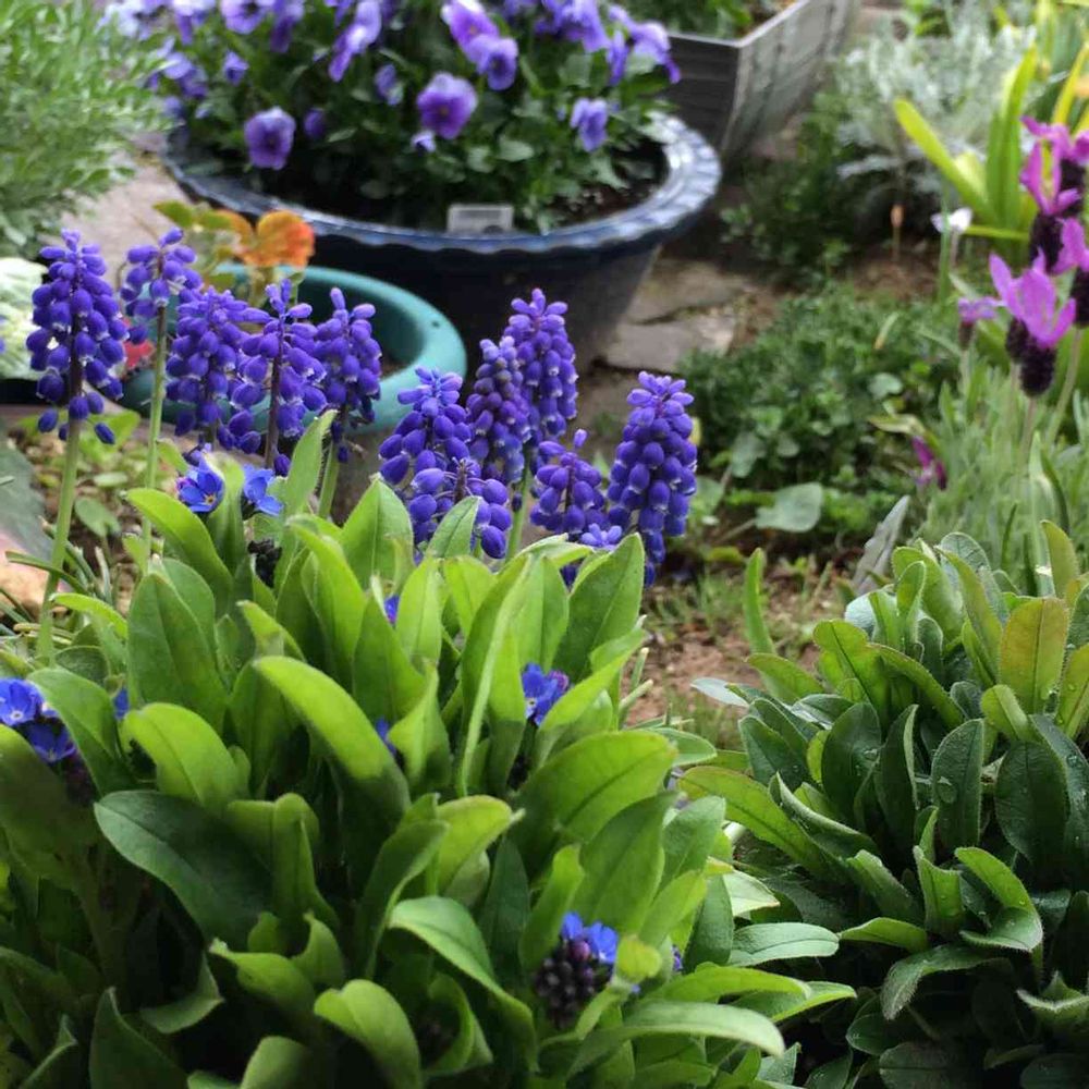 ミオソティスが咲き始めました💕満開のムスカリとパンジー、フレンチラベンダーと青の仲間入りです🍀