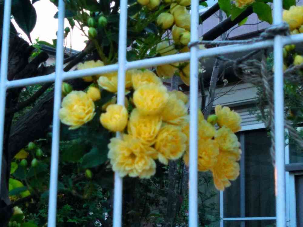 仕事帰りに、通り道のお宅のフェンスから、モッコウバラが覗いて見えました。