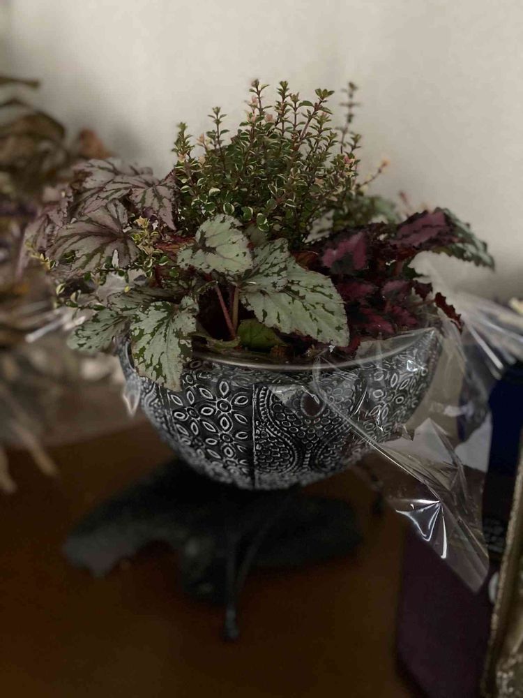 レックスベゴニアとブロードリーフタイムフォックスリーを寄せて玄関に置きました😊