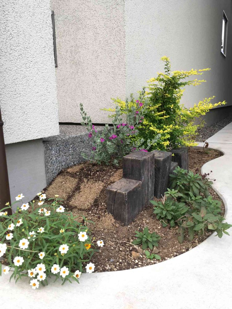 手前に植えていたグラスは、裏庭からこぼれ種を持ってきてジニアに変更。新しい苗でレウコフィルム植え替え。コガネムシ対策で芝を植えてみました。