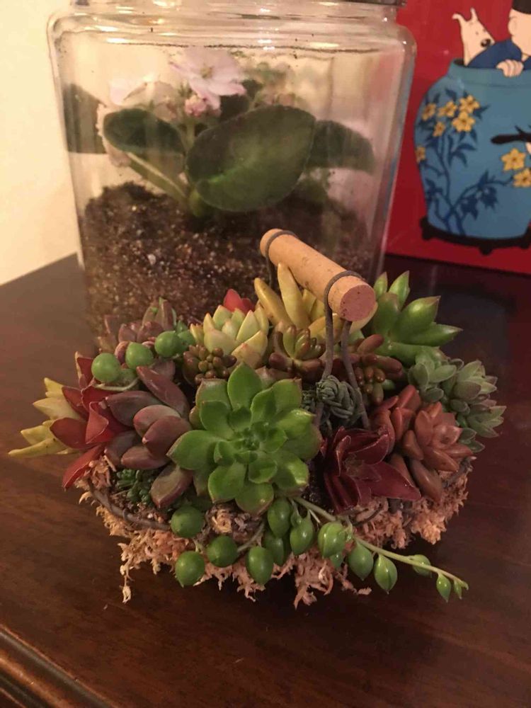 ダイソーのワイヤー籠に寄せ植え。土を盛った上にネルソルで蓋をしてみました。ネルソルより根っこに優しいかな? どうだろう?