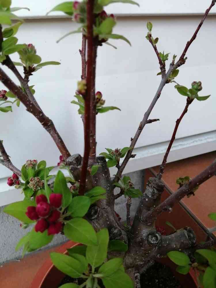 ボケの盆栽は、昨年は花を見て、その後枯れました。今年は、まだ、咲いてますよ。