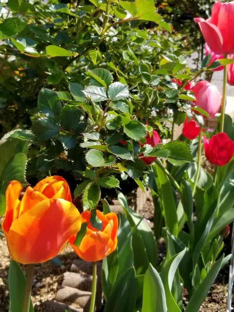 お庭では【チューリップ】🌷さんと【ブルーフォーユー】🌹さんの蕾の共演です❤️