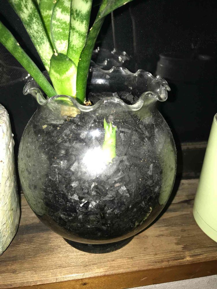サンセベリアを眺めていたら、炭の中からミドリ色、。
