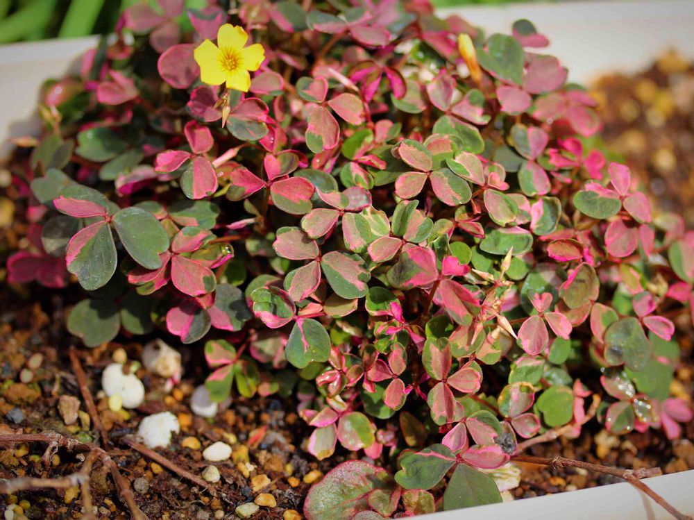 この鉢には、斑入りのポリゴナムも一緒に植えてましたが、こちらは枯れてしまいましたが、オキザリスの株下に根があった分は生きていたようで、写真中央下の方に、少しだけ写っていますが、伸び出してきています。絶えないでよかった。