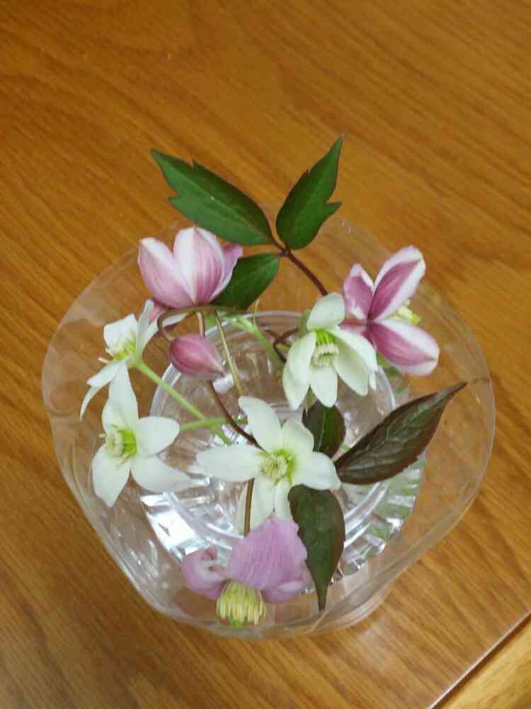 クレマチスカートマニージョーとモンタナを飾ってみました。お花の大きさがほぼ同じことに気づきました。