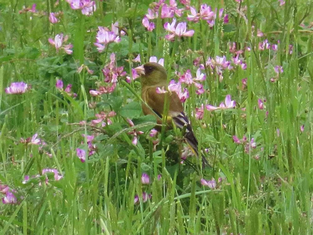 レンゲに埋れるカワラヒワ❣️にくいね!