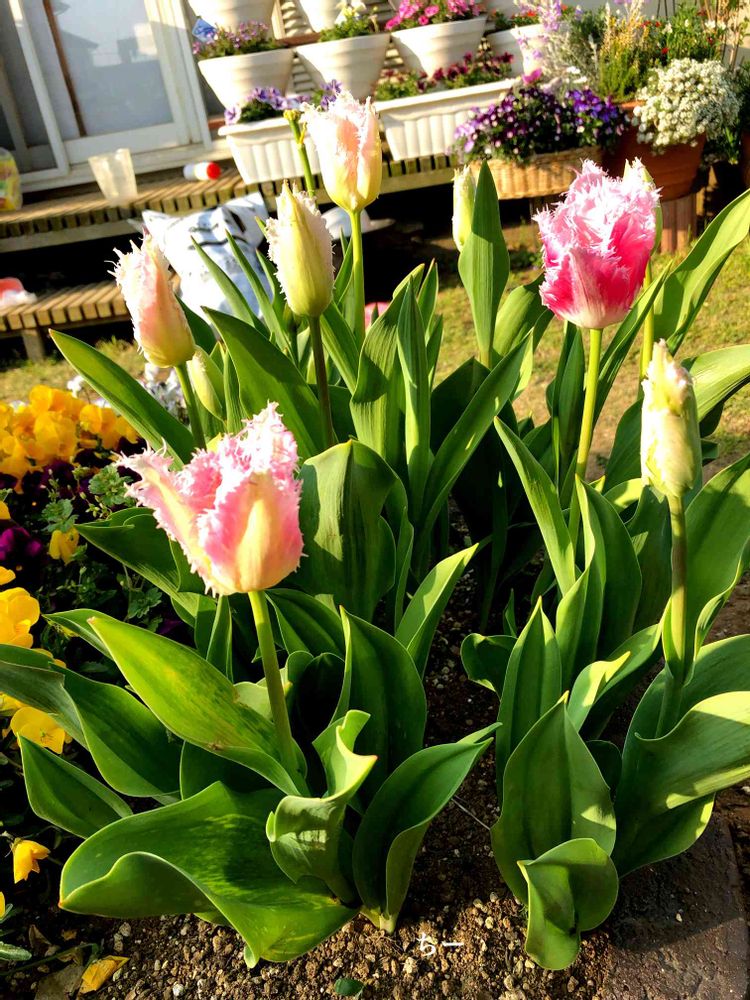 ピンクのチューリップ🌷花びらがチリチリしていて可愛いですよね💕