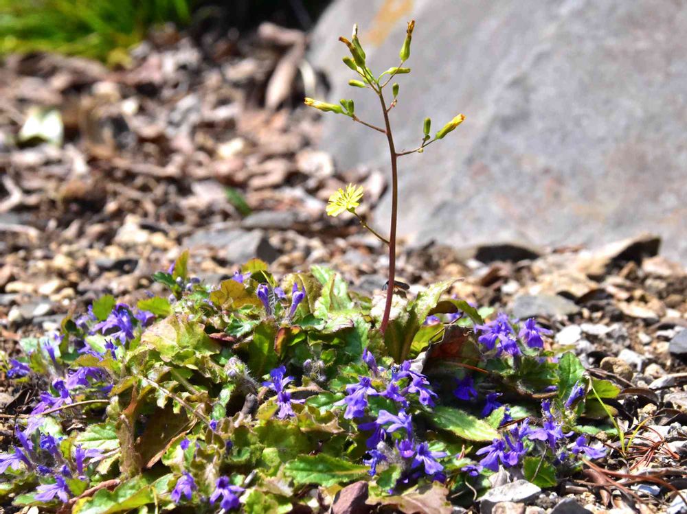 道の脇に雑草みたいにこびりついてる紫の花。よく見たら、キランソウじゃないですか😍 真ん中はタビラコかな?