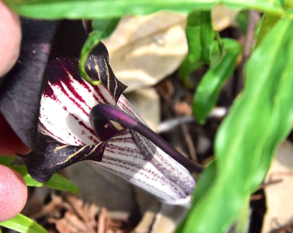 仏炎苞をそっと開けてみました。真ん中に付属体があって、普通のマムシグサなんかは棍棒状に立っているんですが、ウラシマソウのヒゲは、それが伸びたものというのが、よく分かります🧐