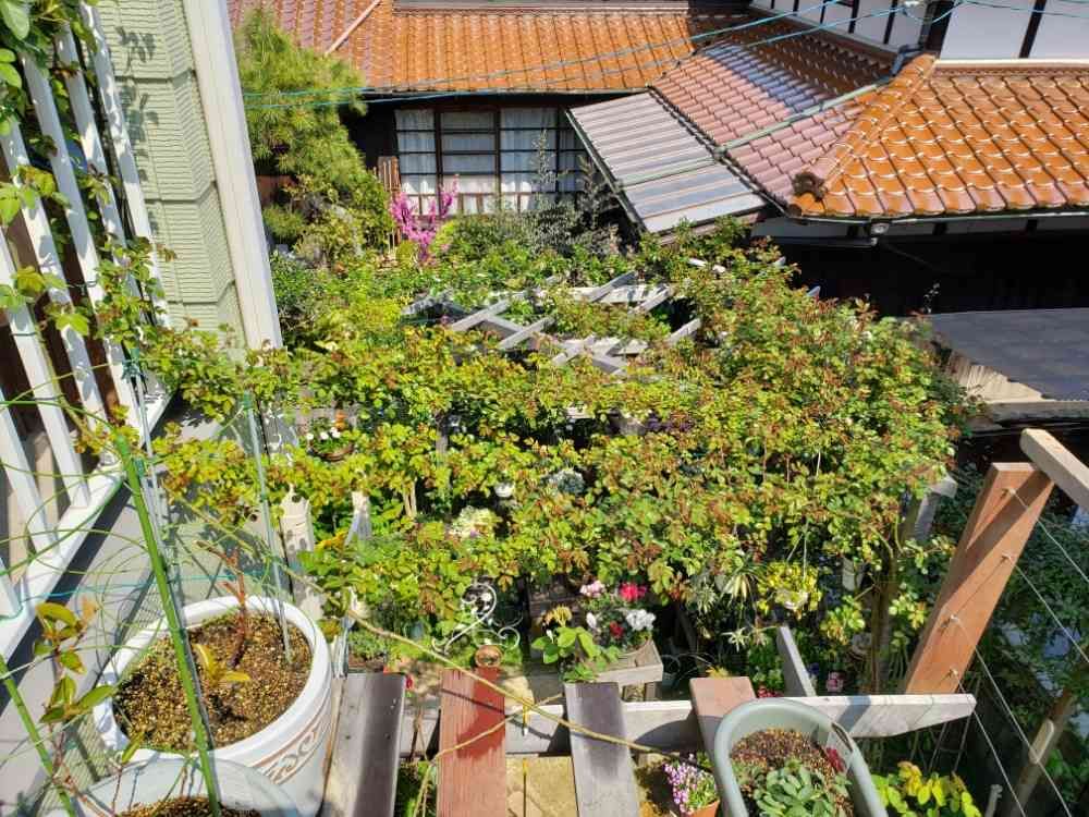 手前のツルバラが、我が家の「春風」です。南側の第三パーゴラの天井上から、撮影しました。今年のツルバラの成長状況は、昨年より、かなりよいです。寒肥が効いているように思います。とても、これからが楽しみです。