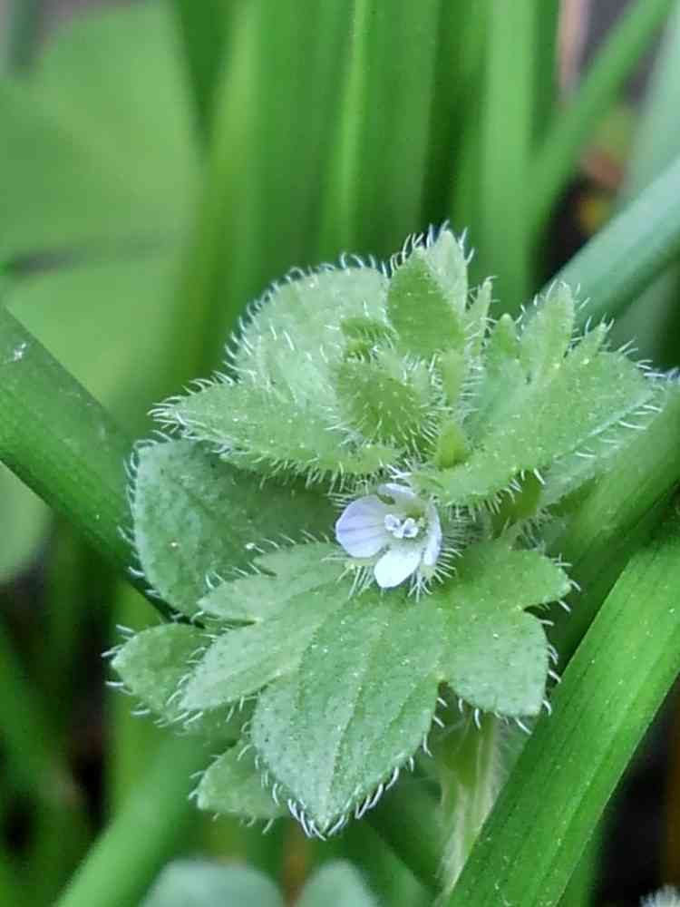 オオイヌノフグリに似ているが 萼や葉に長い毛が目立つ