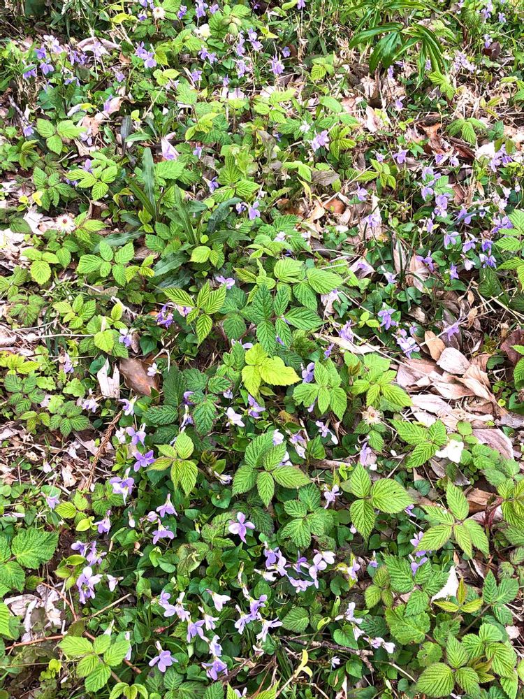 スミレの群生に、クサイチゴの葉が乱入して、シッチャカメッチャカ。クサイチゴ、花はどこいった❓